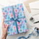 Wrapping paper is shown with a lovely blue and pink daisy floral print.