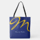 A simple and stylish monogrammed blue tote bag with a big yellow initial
