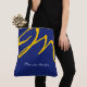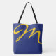 all-over-print blue tote bag with yellow initial