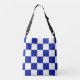 Stylish all-over-print tote bag features a bold royal blue and white checkered pattern with an adjustable black strap.