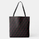 A black and red pattern of small musical notes printed all over the black background of this stylish tote bag