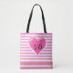 Make a statement with this pink multicolor stripe heart tote bag.