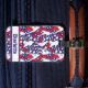Luggage Tag with red and white pickleball players on blue, starry background. Perfect as a gift for a American pickleball player. Customizable name.