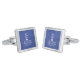 But with God, all things are possible bible verse cufflinks in deep blue with white typography and single white flower accent. KJV Matthew 19.26.