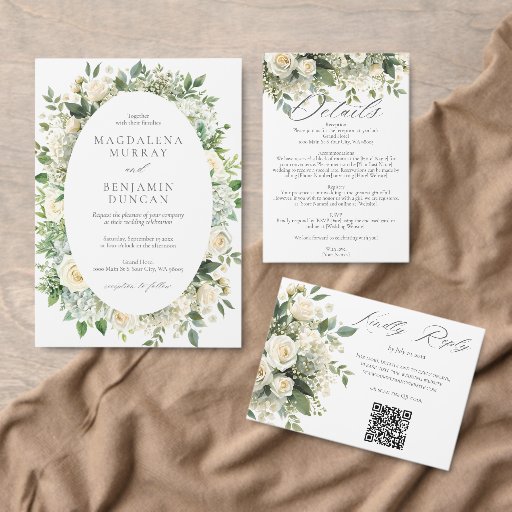 All White Hydrangea Rose Flowers Greenery Wedding Enclosure Card