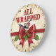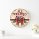 This festive clock features the bold, red text "ALL WRAPPED UP" on a vintage, aged parchment background studded with gold nail heads or rivets. The lower half of the clock is dominated by a large, sumptuous red velvet ribbon tied in a bow, accented with holly and red berries. A red ribbon border runs horizontally across the center. The design may look real due to the high detail and three-dimensional texture in the artwork.