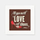 A fun design of a poster style that says all you need is love and shoes. The words are in a nice font and then there is a red shoe in the left corner. This all you need is love and shoes design looks great. Perfect for yourself or as a gift