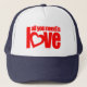 Keep the sun off with this white hat embellished with "all you need is love" red text graphic by Sarah Trett. Ideal for showing your love and keeping the sun off at music festivals.