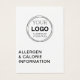 Give your customers up to date allergen and calorie information about your food products with these customizable product cards. Each featuring your "add your own" logo and a QR code on the back that links the customer directly to your allergen/ calorie webpage. Generate a brand new QR code using the "personalize this template" option on the product page. Add the URL to your allergen webpage in the box provided and a brand new QR code will appear on your design that links to your URL.