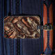 Close-up of intricately carved alligator heads and tails on a leather surface, featuring a belt buckle and detailed floral patterns.