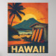 Capture the warmth of Hawaii with this vintage-style travel poster featuring surfboards, volcanic peaks, and golden beaches. A retro nod to island adventure and laid-back vibes.