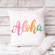 Tropical typography pillow features the Hawaiian greeting "Aloha" in a fun festive gradient of summer colors - pink, coral, orange and aqua blue on a white background.