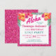 This beautiful square shape invitation features a bright tropical “Aloha”, hibiscus flowers, and a hot pink faux glitter border. Text can be edited or deleted as desired. Other sizes available. Matching party supplies available in my store. Design©Rosalind Moore, Cherry Lane Designs.