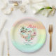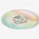 Tropical summer Hawaiian-themed party paper plates in pastel colors, featuring a tropical heart with a beach view, flamingos, and flowers with a rainbow-colored background. Easily personalize the text. - Kate Eden Art