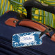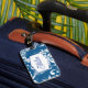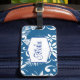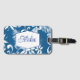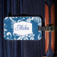 This luggage tag is shown in a lovely blue tropical print.