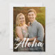 Modern, tropical holiday card displaying your full-bleed vertical photo on the front with "Aloha" in a white hand-lettered script complimented by a hand-drawn palm tree. Personalize the front of the Aloha holiday card by adding your name. The card reverses to feature space for an additional photo and custom text with white ocean waves against a light grey-blue background. Designed to coordinate with our Aloha Palm Tree holiday collection.