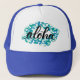 Say Aloha everywhere you go with the Aloha Plumeria Lei Trucker Hat. Modern brush lettering calligraphy on original watercolor artwork by Handwritten Aloha.