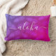 “Aloha”. Bring a bit of Hawaiian island hospitality into your home with this brightly colored, chic, striking, stylish, modern lumbar throw pillow sporting crisp, white handwritten script typography over a graphic, pineapple pattern in a vivid purple and hot pink ombre. Makes a fun and stylish statement every time you relax on it. A great addition to your living room or bedroom, as well as a wonderful gift for a friend!