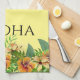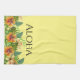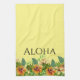 Island themed kitchen towel with watercolor tropical flowers and "Aloha" inviting text
