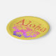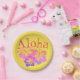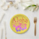 "Aloha" in fun retro style font on yellow background with purple ombre hibiscus tropical flower trio. Perfect for a luau, backyard pool party, birthdays and more