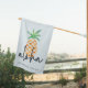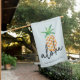 A great gift for newlyweds or new homeowners, our personalized welcome house flag features the Hawaiian greeting "aloha" in handwritten script lettering with a watercolor tropical pineapple illustration on a pastel gray-blue background. Personalize with your family name and year established along the bottom.