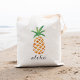 Cute tote bag design features a pineapple illustration, the traditional symbol of hospitality, in sheer, pretty watercolors. Dark gray calligraphy script lettering defaults to "aloha," but you can easily replace the text and personalize with a name or message. Makes a great welcome bag or favor for Hawaii weddings or destination weddings! Coordinating accessories available in our shop.