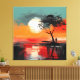 This atmospheric artwork captures a quiet moment of solitude beneath a glowing sunset. A lone figure stands by the water’s edge beside a windswept tree, silhouetted against a vast sky painted in warm shades of burnt orange, coral red, and soft gold. The oversized sun hangs low on the horizon, its light reflected across the still surface of the lake, creating a dreamlike mirror of color and emotion.