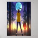 A young person in yellow t-shirt and black pants alone in the forest looking at the moon. This is a AI generated art