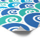 Poster with design of different shades of blue waves with the sun rising on the horizon.