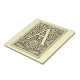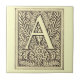 vintage, decorative, and ornate letter of the alphabet with the letter a in bold font on a background of filigree flowers and leaves with a flower in the center and leaves swirling and radiating out in ornate fern shapes with little flowers between the leaves. one of the letters of the alphabet on a floral background in an old world elegant and feminine etching in beige and brown colors.