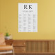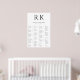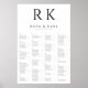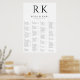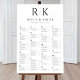 A classy black and white seating chart with the bride and groom's initials at the top. This minimalist design is always a popular choice. The alphabetical guest list makes it easy for friends and family to locate their names.