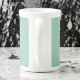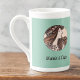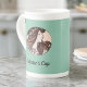This lovely design features an Art Nouveau image by Alphonse Mucha of a woman with flowing hair and a garland of light pink flowers on a vintage green background. Mucha created beautiful art, often for posters and advertisements, of women and flowers in flowy costumes with graceful and sinuous hair. This public domain image is part of his work called Vitrail pour la façade de la boutique Fouquet Vlll. This image appears on both sides of the cup.