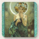 Alphonse Mucha Clair De Lune coasters. Lithograph allegorical painting. Alphonse Mucha is famous for his art nouveau advertisements and posters featuring beautiful young women surrounded by flowers and intricate ornamentation. Clair de Lune or Evening Star features a gorgeous young woman wearing a starry dress. She wears flowers in her light brown hair as the crescent moon glows behind her. A great gift for fans of Alphonse Mucha, art nouveau, and vintage posters.