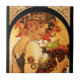 Alphonse Mucha Fruit tile. Lithograph poster from 1897. Czech artist Alphonse Mucha painted a variety of different allegories throughout his career. Fruit depicts a beautiful woman holding an armful of purple grapes, green pears, figs and red apples. The woman’s dark hair is adorned with flowers and leaves, and she wears a light blue art nouveau dress with silver clasps and gold armband. A beautiful gift for fans of Mucha, art nouveau posters, and vintage prints.