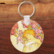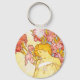 Alphonse Mucha Iris key chain. Oil painting on canvas. Czech painter Alphonse Mucha painted an allegorical series depicting various flowers as beautiful women. Iris features an attractive brunette wearing a thin dress. The woman is surrounded by giant purple irises that climb the yellow and blue background. A great gift for fans of Mucha, art nouveau, and allegorical flower paintings.
