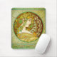 Alphonse Mucha Laurel mouse pad. Lithograph poster from 1901. Czech artist Alphonse Mucha was renowned for his allegorical works. Laurel is a painting featuring a beautiful young brunette draped in ivy. She looks onward in profile and wears a yellow rose on her chest. The poster is intricately ornamented with interlocking ivy leaves, tiles and arrows. A great gift for fans of Mucha, art nouveau posters, and vintage prints.