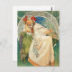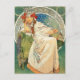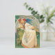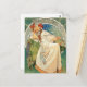 Alphonse Mucha Princess Hyacinth postcard. Lithograph poster from 1911. Czech artist Alphonse Mucha created some of the most gorgeous advertisements and posters of the art nouveau period. Princess Hyacinth is a work featuring a beautiful girl wearing a crystal crown with red flowers in her hair. The woman holds a crystal snowflake and sits in a cream colored gown. Behind her the poster is ornamented with an intricate pattern of stars, crowns, and other shapes. Above reads the text “Princesna Hyacinta.” A beautiful gift for fans of Alphonse Mucha, art nouveau, and vintage posters and advertisements.