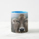 A photo of two braunvieh alpine cows with fluffy ears on a misty mountain background.