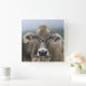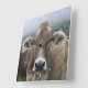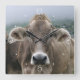 A photo of two braunvieh alpine cows with fluffy ears on a misty mountain background.