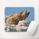 Closeup Alpine marmot (Marmota marmota) on rock on blue sky background, in the French Alps, Savoie department at La Plagne