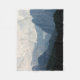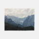 Blanket with a photograph of beautiful mountains, cloudy sky, and rolling hills filled with trees in the foreground. Gray blue color scheme.