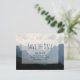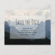 Save the date wedding postcard with a photograph of beautiful mountains, cloudy sky, and rolling hills filled with trees in the foreground. Gray blue color scheme.
