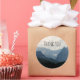 Thank you stickers with a photograph of beautiful mountains, cloudy sky, and rolling hills filled with trees in the foreground. Gray blue color scheme.