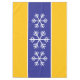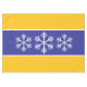 This festive winter holiday design features triple white Nordic snowflakes inside deep blue, white, and yellow orange stripes. The colors in this design can be personalized by editing the design.