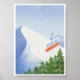 Vintage style ski travel poster of the Alps mountain range. Illustration of a cable car above pine trees.