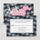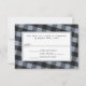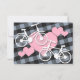 Custom Wedding RSVP reply cards with an alternative design featuring 2 white his & hers bicycles over pink hearts, and placed on a tilted black and blue gray gingham pattern.