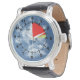 Not a real altimeter, the hands move clockwise, but the danger zone between the hours of midnight and 3 AM are highlighted in yellow and red for the night owls. Trendy altimeter clock face wrist watch over a blue sky background with clouds, calibrated for 12,000 feet of free fall for skydivers.