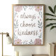 Spread positivity with this beautiful "Always Choose Kindness" wall art. Featuring delicate pink flowers and green foliage surrounding the hand-lettered script, this piece adds a gentle reminder of kindness to any space. Perfect for creating a peaceful atmosphere in your home, office, or as a thoughtful gift for someone special, this artwork encourages a life filled with compassion and positivity.