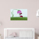 Ladybug clinging to a pink flower looking down at another ladybug standing in the green grass, with blue skies all around.