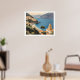 A coastal hillside village overlooking a deep blue bay, with terraced buildings and a domed church in the foreground. The scene reflects southern Italian coastal architecture, characteristic of the Amalfi Coast.